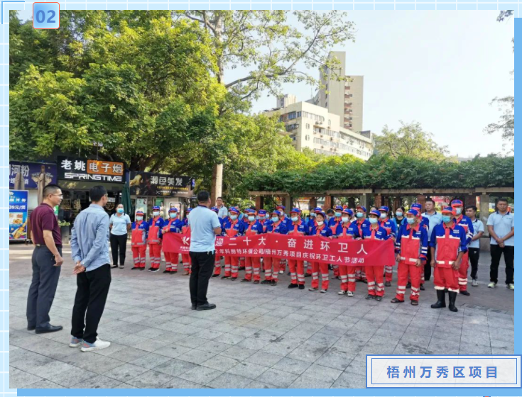 當天下午項目在梧州市萬秀區旺城(chéng)廣場進行環衛工(gōng)人(rén)節慰問(wèn)及頒獎活動。梧州市城(chéng)管局主要負責人(rén)到現場慰問(wèn)項目環衛工(gōng)人(rén),對他(tā)們在營造幹淨整潔的城(chéng)市環境付出的辛勤勞動,尤其是對在創建全國(guó)文明城(chéng)市和抗擊新冠疫情中做出的積極貢獻表示誠摯的感謝,并向他(tā)們緻以節日(rì)的慰問(wèn)和祝福。
