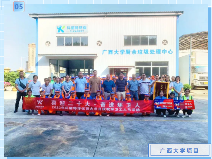 當天下午項目全體(tǐ)員(yuán)工(gōng)在廣西大(dà)學廚餘垃圾處理(lǐ)中心舉辦2022年(nián)環衛工(gōng)人(rén)節活動頒獎儀式,廣西大(dà)學後勤基建處副處長農漢發、廣西大(dà)學後勤基建處主任覃琨、科(kē)麗特副總經理(lǐ)劉奠彬參加本次頒獎儀式,并爲獲評科(kē)麗特2022年(nián)優秀個人(rén)、班組頒獎。